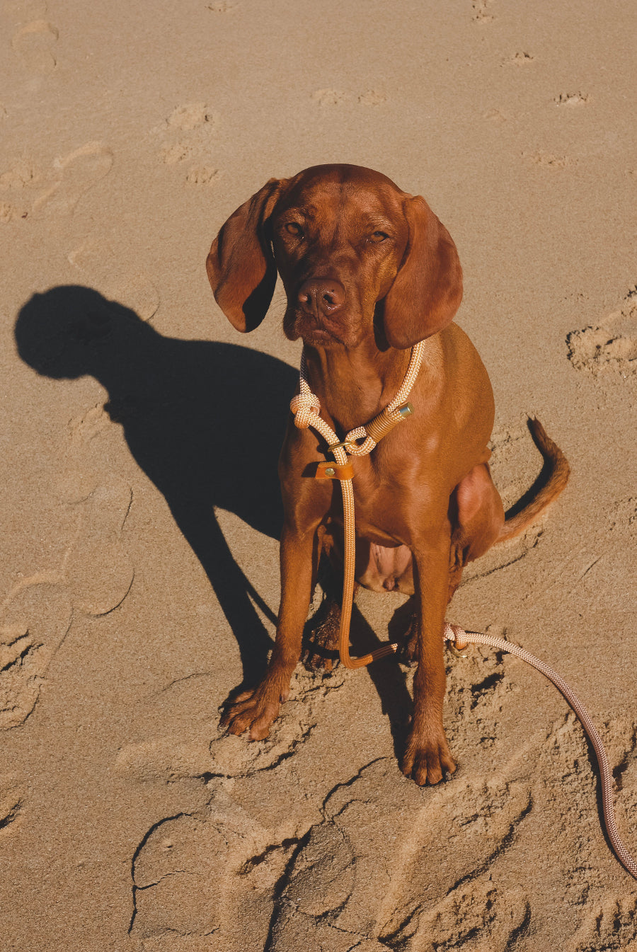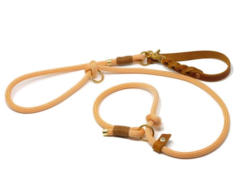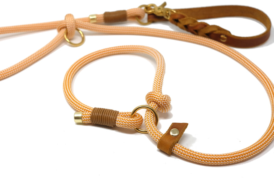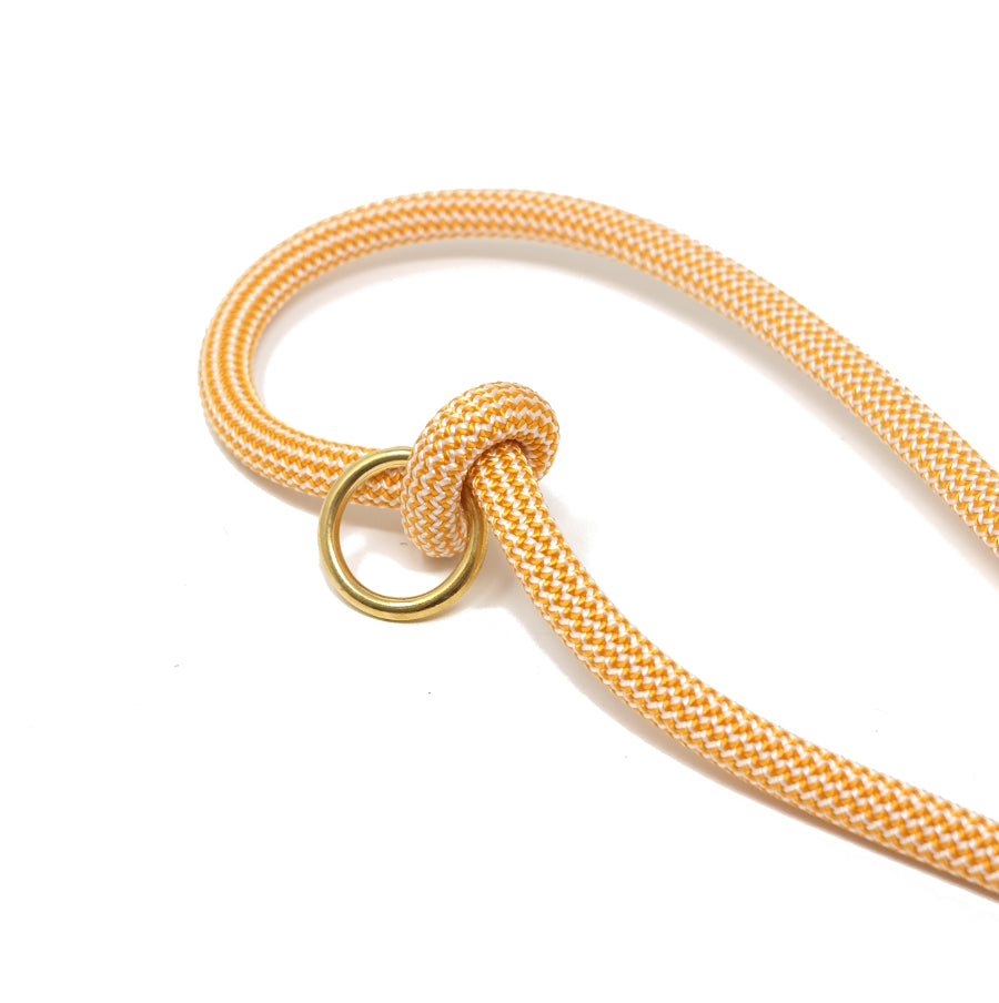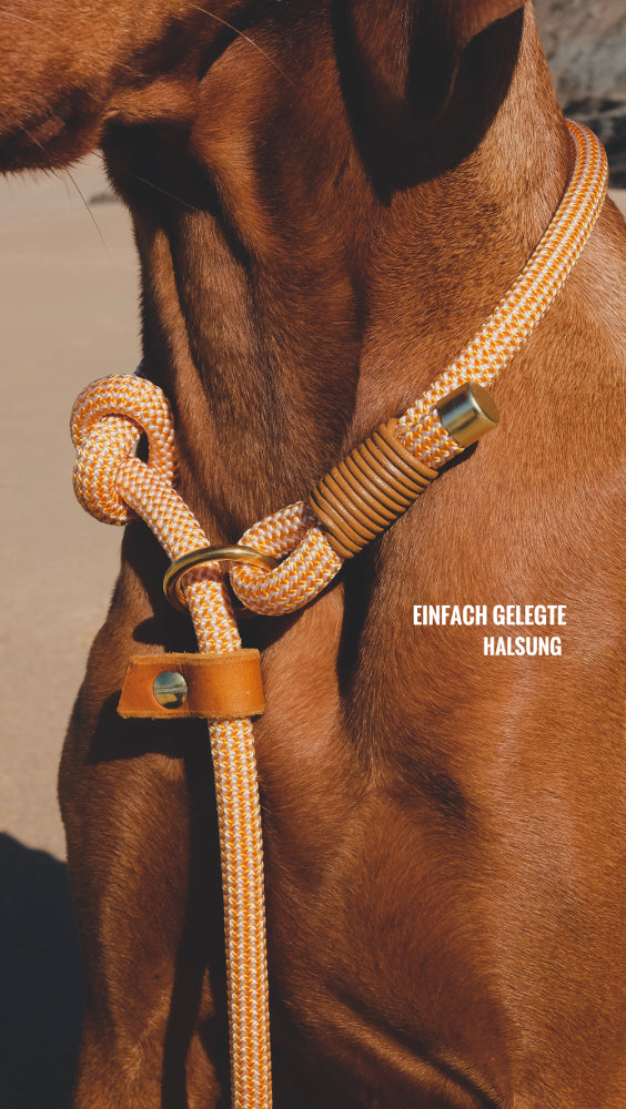 Ein hochwertiges Kletterseil in einem gelb-orangenem Honigton, trifft auf eine Handschlaufe aus unserem wunderbar weichen und robusten Fettleder in der Farbe cognac. Damit dein Hund beim Abnehmen der Leine im Freilauf nicht ganz "nackig" ist, empfehlen wir zu Retrieverleinen unser Markenhalsband "Oh, Dear!".